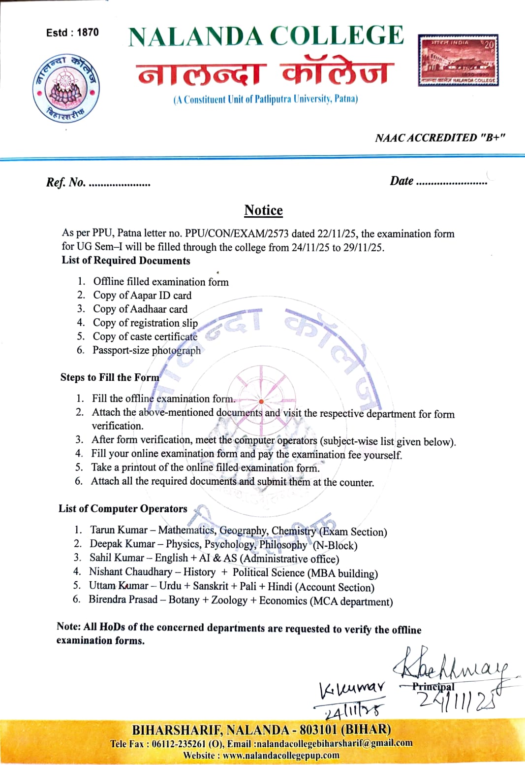 Notice: Companies interested in signing an MoU with Nalanda College for the Internship Program are requested to connect with their proposal on or before 18/10/2025. | UG SEM-V Admission Notice | 🤖 UG CBCS SEM-I ADMISSION SESSION 2025-2029 | 🎓 Admissions open for 2025